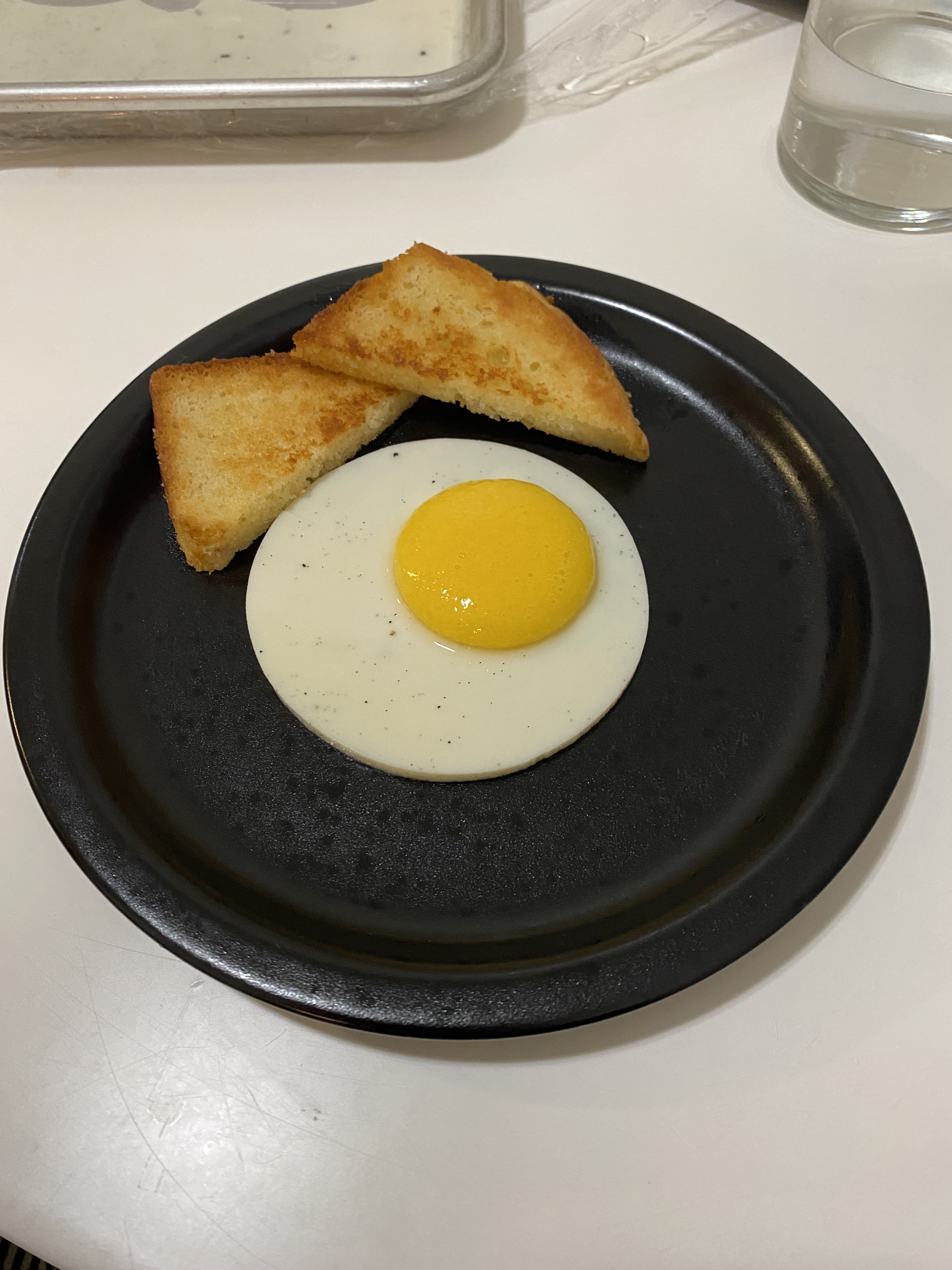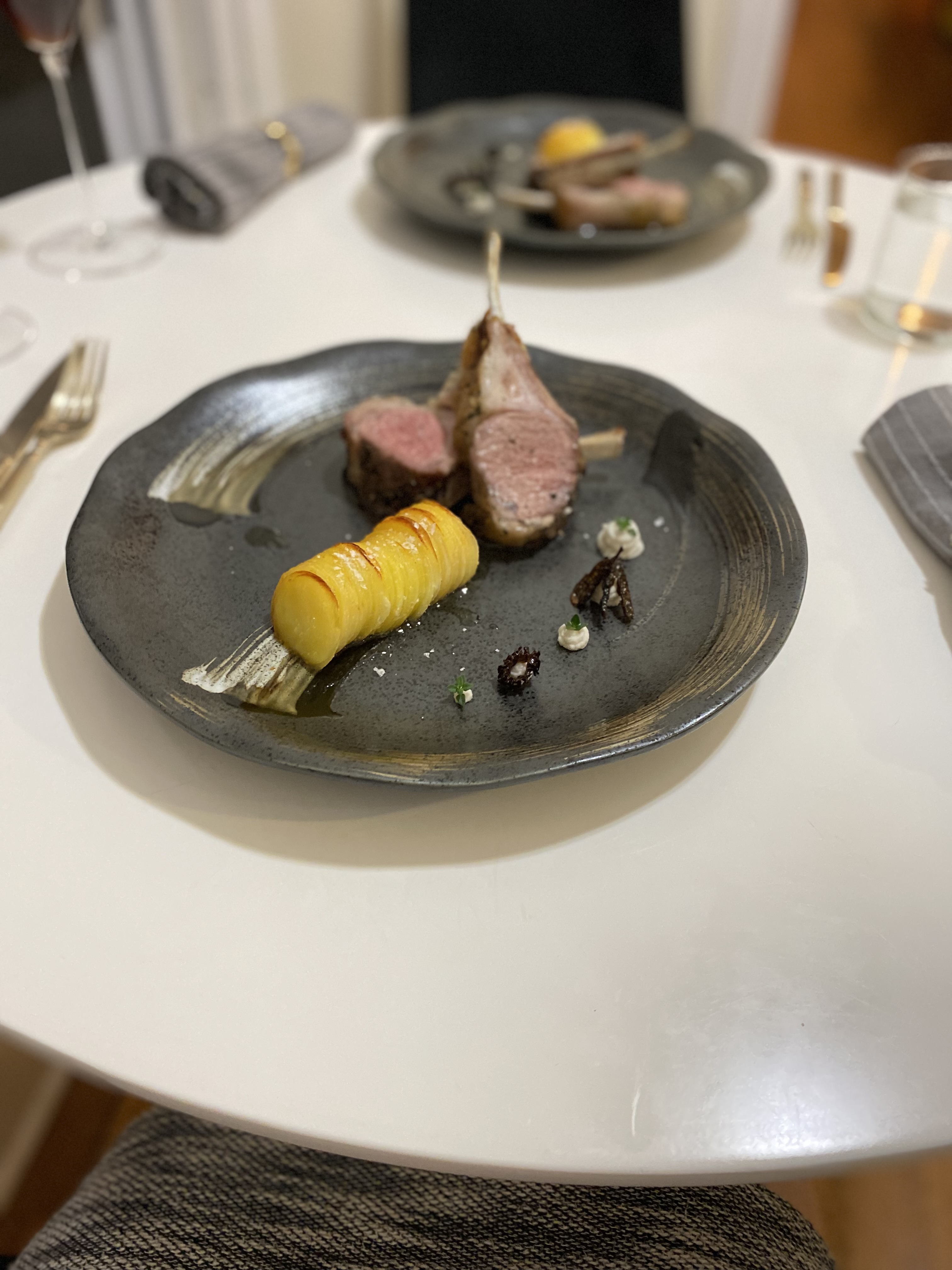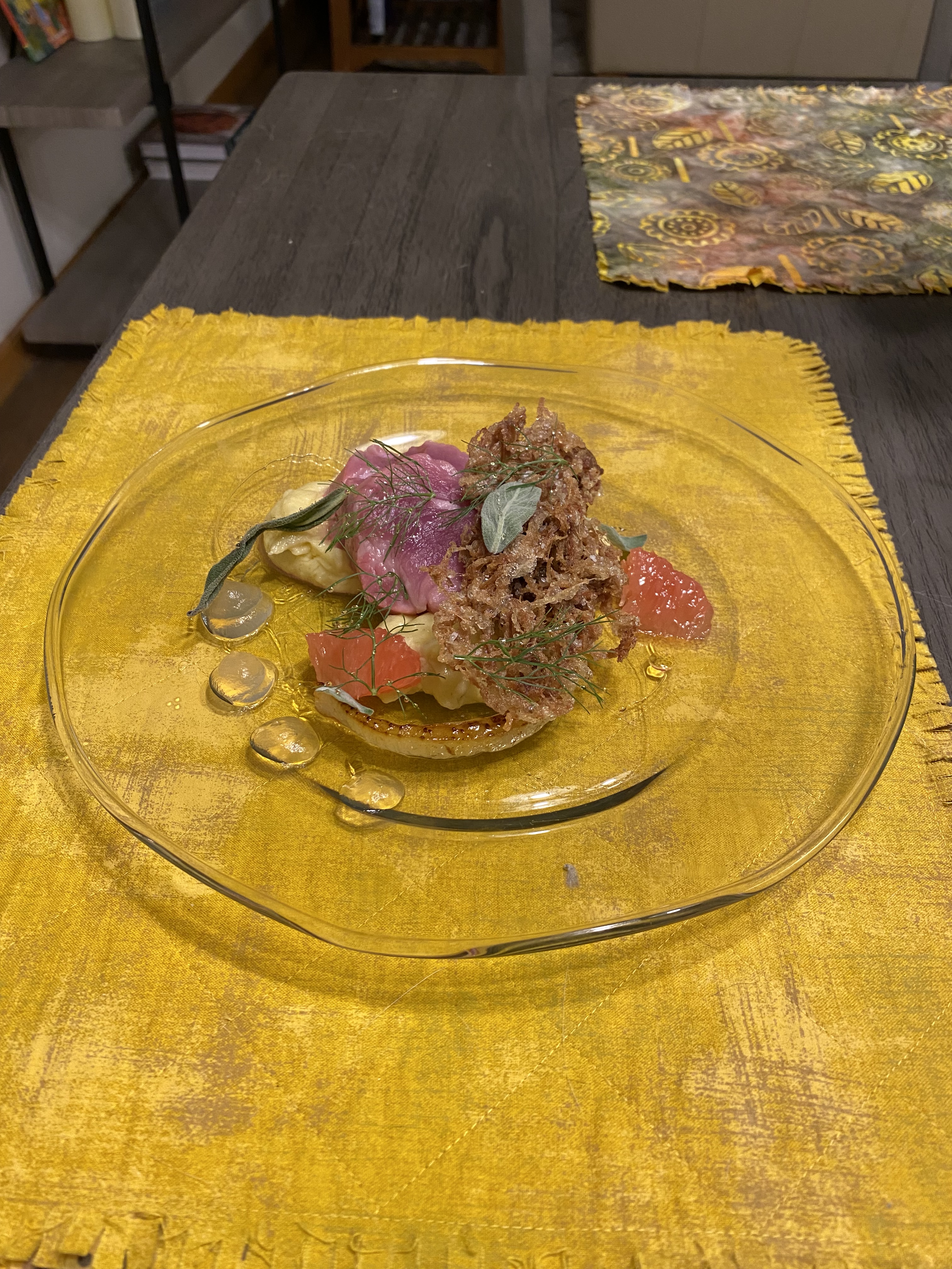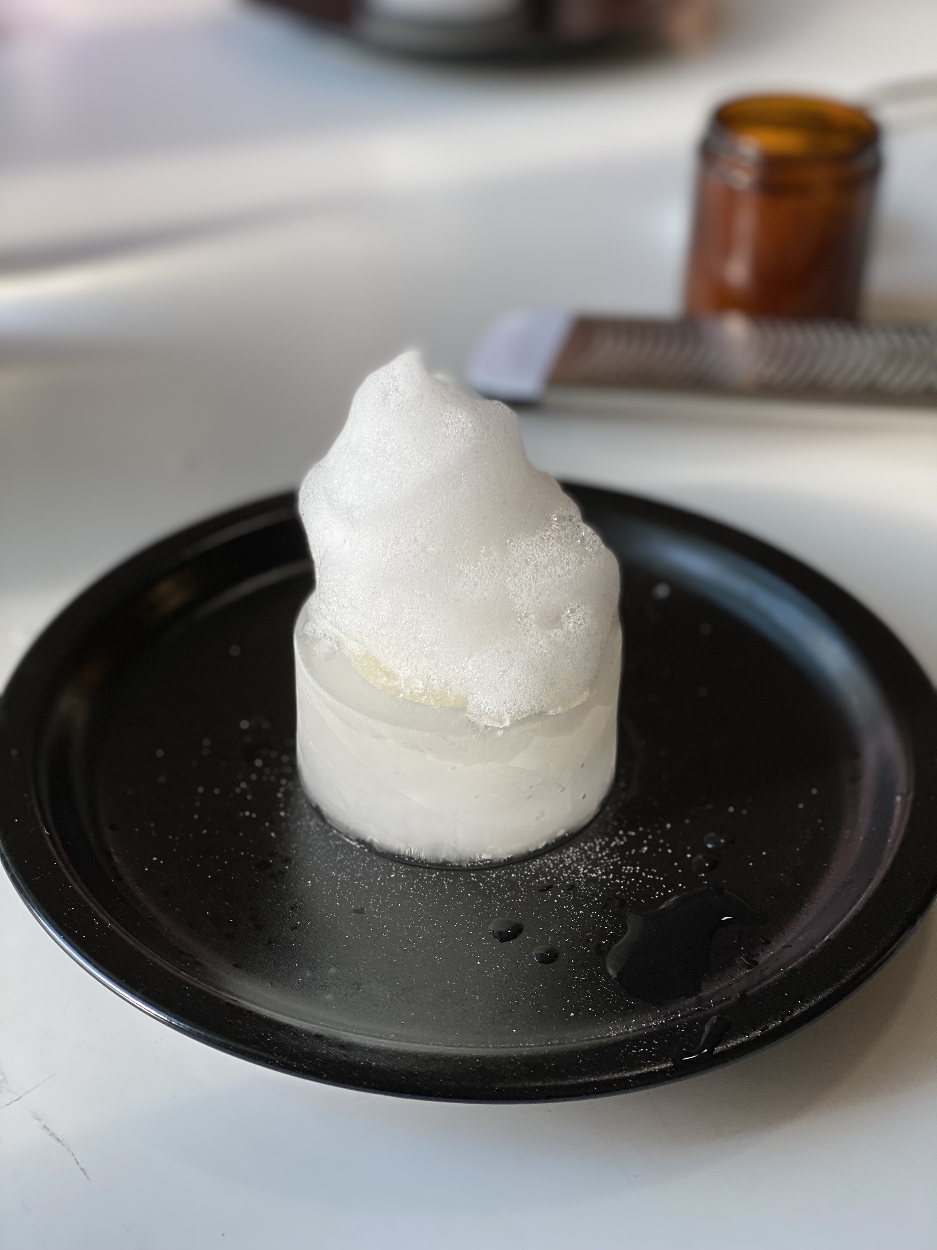 Above are some of the dishes I have made in the past couple months! The first is an improvised dinner I made the night my partner and I went to a dance performance. It consisted of herb coated roasted rack of lamb, confit potatoes, onion gel, thyme, and sautéed morels. The second is my first recipe from the elBulli cookbook: the margarita frappé with salt air. The third is my second Alinea dish that I made to celebrate 5 months with my partner on NYE. It is pork tenderloin, puffed pork shoulder, cornbread purée, sage fluid gel, grapefruit supremes, and honey. The last dish is the first one that I developed. The “egg” is a passionfruit and mango purée sphere on a vanilla cream gel served with lemon almond toast.