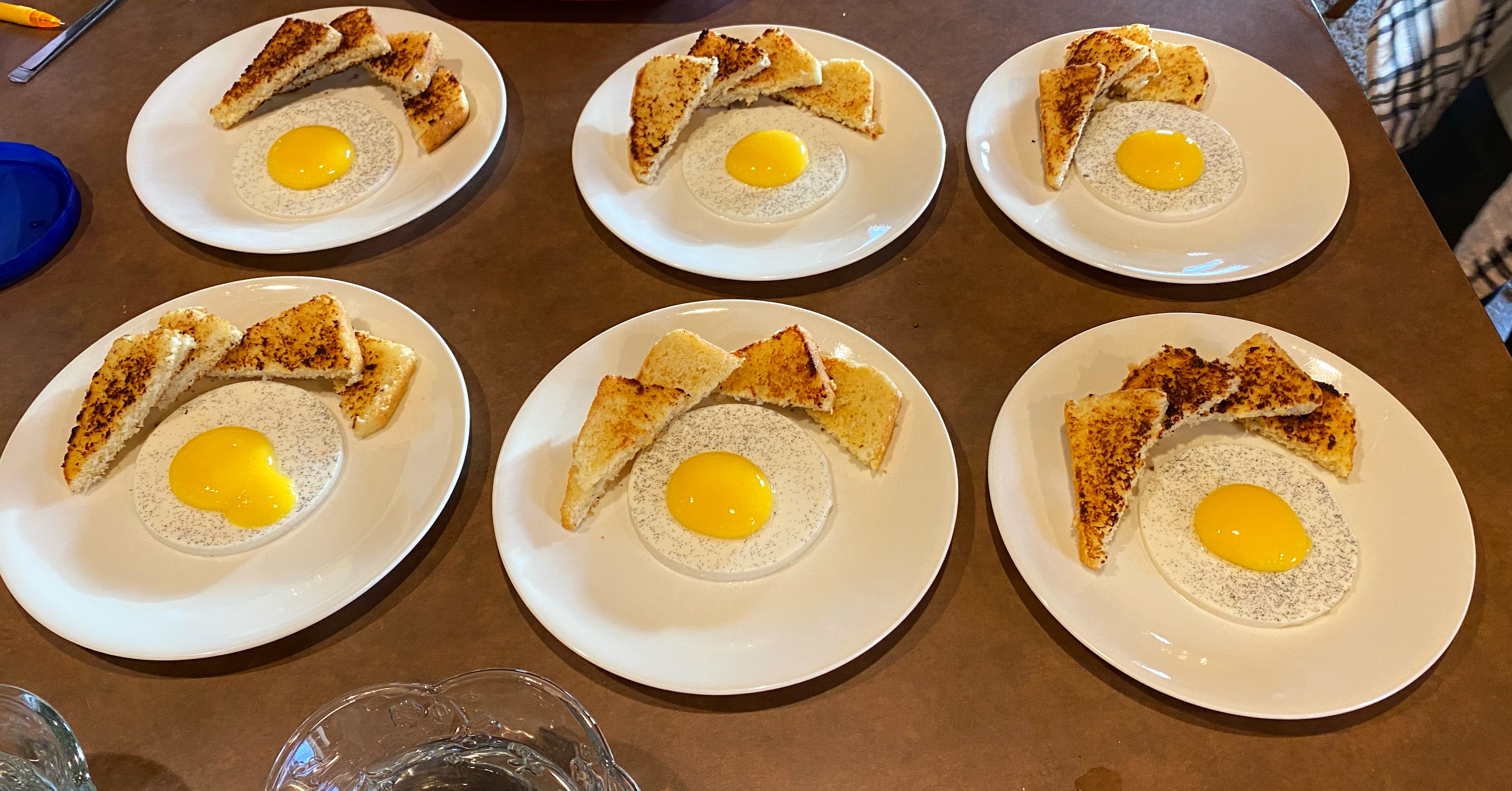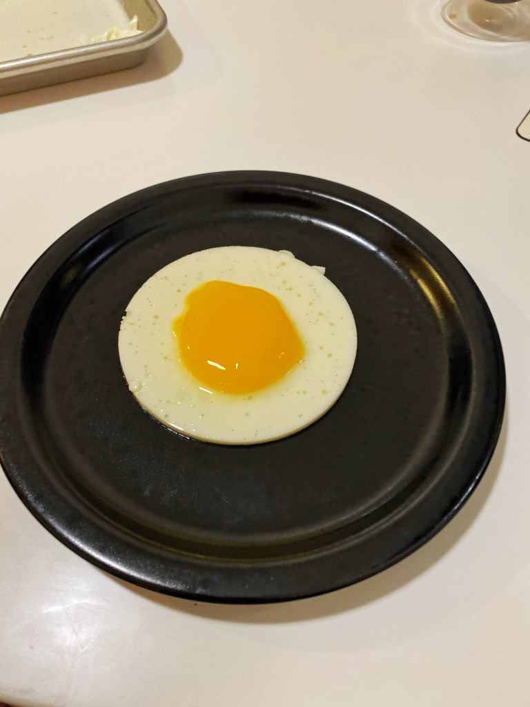 This dish originally came to me while I was riding in a car with a friend after brunch one day around Christmas 2020. They had fried eggs as part of their meal and, for whatever reason, the idea occurred to me that it might be amusing to have something that you would normally start your day with be one of the last dishes of a meal. However, a fried egg isn’t necessarily the best dish to put at the end of a multi-course meal. So, I started pondering how to make it something sweet so it could be served as a pre-dessert or dessert.