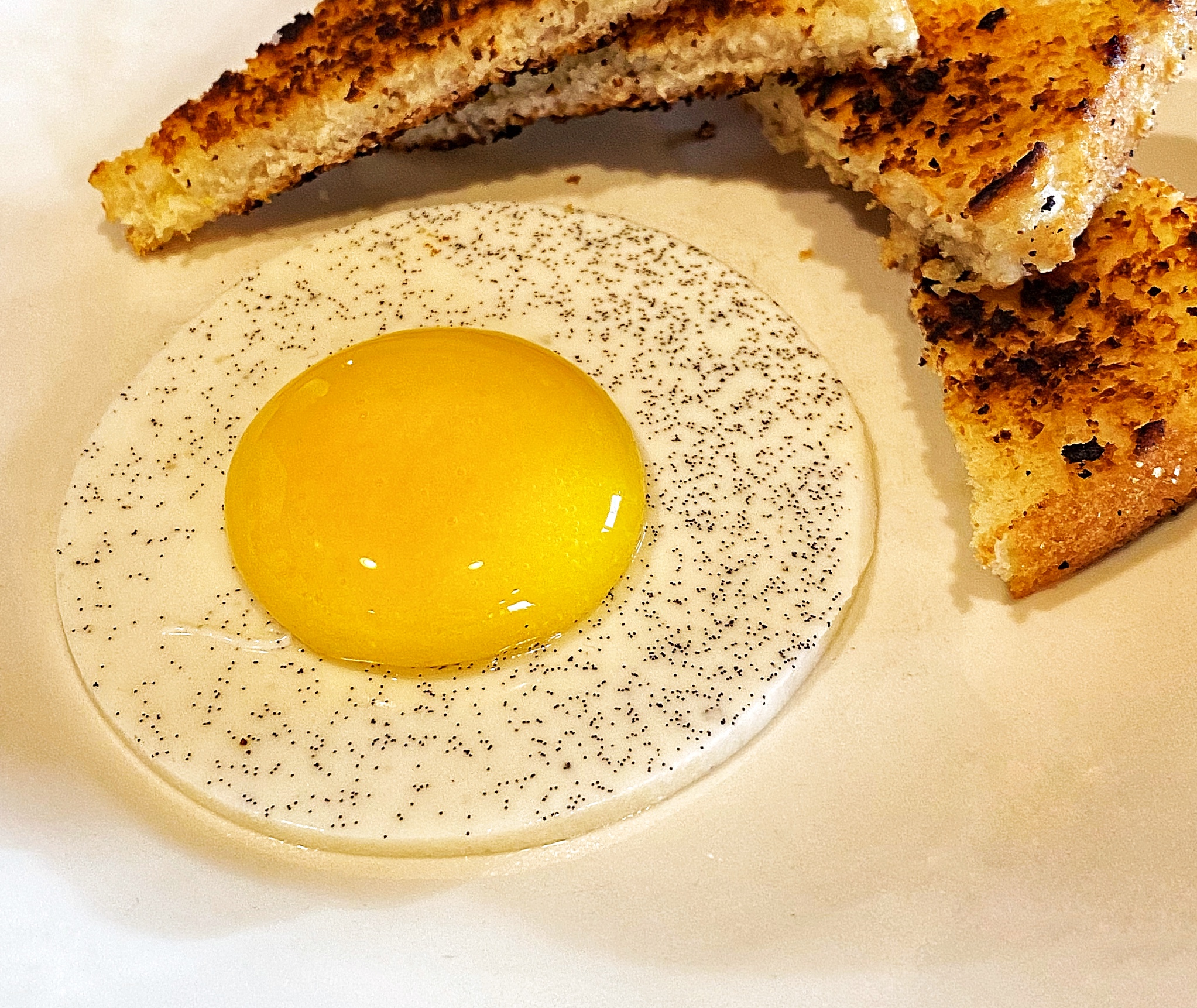 Just before serving, I toasted thin slices of almond bread in a little European butter until it was nicely crisp on both sides. My partner sampled this iteration with me and made the observation that something acidic or citrusy in the toast would help tie it in better with the fruit flavors in the egg yolk.